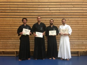 Vše se chýlí ke konci. Závěr mého pobytu je ranní nedělní trénink s výběrem iaididtů Yamagaty v dojo v Yamanobe. Cvičí se společně katy (wazy) Seitei iai a závěrem také enbu, po skupinách, po jednotlivých stupních od 3.danu až po 6. dan. Na místě shinpan (soudce, posuzovatele) sedí pan Harada s dalšími dvěma 8. dany. Dávám do toho vše, zítra ráno odjíždím tak, ať je vidět, že jsem se tu neflákal. Pan Harada už nic ke cvičení neříká, je spokojen a já také. Ptám se, jestli to bylo v pořádku a zda má nějaké připomínky. Usmívá se a říká, v pořádku 🙂 . Z toho jsem trochu nervózní, ale mám radost.
