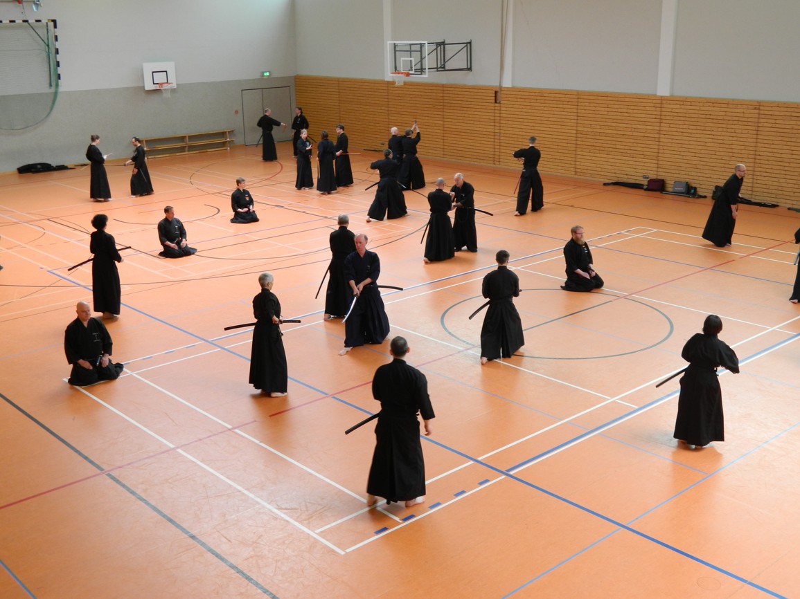 Seminář byl naplánován dle rozpisu velmi stroze pohledem našich zkušeností z jiných zkouškových seminářů. Sobota odpoledne 4 hodiny cvičení iaidó, pak hned zkoušky před pětičlenou komisí učitelů a v nedělní části 3 hodinové cvičení iaidó. Sobotní části semináře se zůčastnilo cca 60 lidí z toho 12 mělo v plánu skládat zkoušky (4 lidé na první dan, 3 lidé na druhý dan a 5 lidí na třetí dan). Byli jsme jediní cizinci. Lidé byli rozděleni do čtyř skupin (skupina lidí připravujících se na zkoušky a tři skupiny dle stupňů). O výuku nebo pomoc při výuce se staralo hned několik učitelů paní Sylvia Ordynsky (7.dan iaido) a Rudi Müller (6.dan iaidó, Aikikai Bamberg e.V.), Peter Röder (6.dan iaidó), Henry Schubert (6.dan iaido). S asistencí jim pomáhali ještě pánové Wim van Mourik (5.dan iaidó, Hakushinkai Berlin) a Peter Kern (5.dan iaidó, Aitokan Bad Homburg). Všechny skupiny se věnovali ZNKR Seitei iaidó. Naší „zkouškovou skupinu“ měl na starosti Henry Schubert. Věnovali jsme se Reihó a postupně kata ke zkouškám (seznam požadovaných 5 kata na každý stupeň přinesl Henry Schubert sebou – na 3.dan to byly Mae, Ukenagaši, Morotecuki, Sanpógiri a Sógiri). Velmi intenzivně vysvětlil hlavní body, zacvičil danou kata a ukázal, co nedělat. Výklad i demonstrace byla perfektní a co navíc, vždy procvičovanou kata shlédnul u každého a konkrétně mu opravoval chyby, či podněcoval ke zlepšení – efektivní a potřebné – přesně to, co člověk potřebuje před zkouškama slyšet pro svůj rozvoj.  Celkově to byly intenzivní 4 hodiny strávené přípravou na složení zkoušek a zaměřené na tento výsledek. Z vedlejších „nezkouškových skupin“ ve výkladu často zněla jména učitelů Sagawa, Furuiči, Išidó, ale obsah jsem nesledoval. V pauze mezi cvičeními za námi přišel pan učitel Kern – si popovídat, seznámit se a laskavě i přátelsky nám dával rady. Zkoušky pak proběhly rychle, důstojně a s dobrým koncem pro nás.