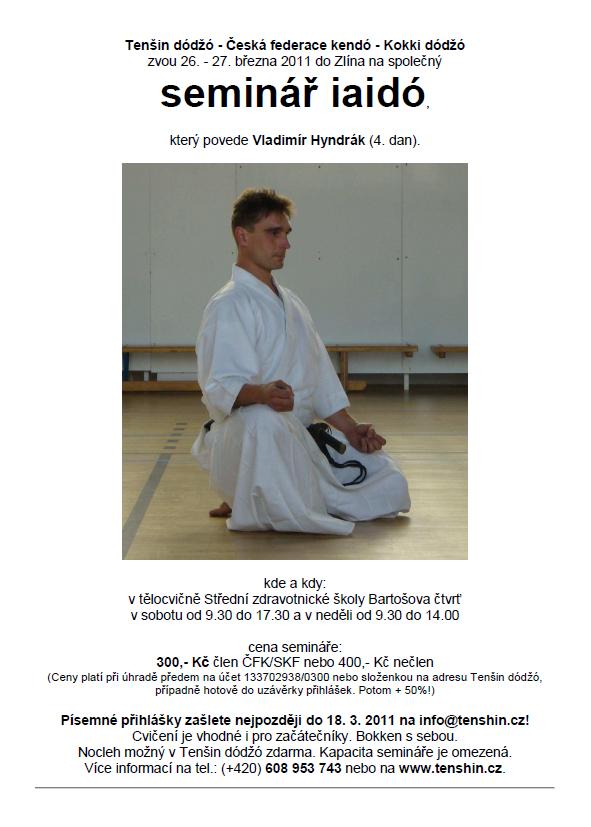 Iaido seminar with Vladimir Hyndrak ( 4.dan ZNKR iaido ), member of Kokki dojo and Czech kendo federation. Place of seminar: Zlin (Czech Republic), Date: 26.-27. March 2011, Informations and registrations: info@tenshin.cz